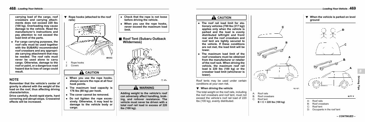 carrying load of the cargo, roof crossbars and carrying attachments does not exceed 220 lbs( 100 kg). Overloading may cause damage to the vehicle. Read the manufacturer’ s instructions and pay attention to not exceed the load limit of the parts.