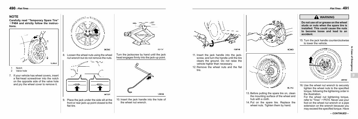 Do not use oil or grease on the wheel studs or nuts when the spare tire is installed. This could cause the nuts to become loose and lead to an accident.