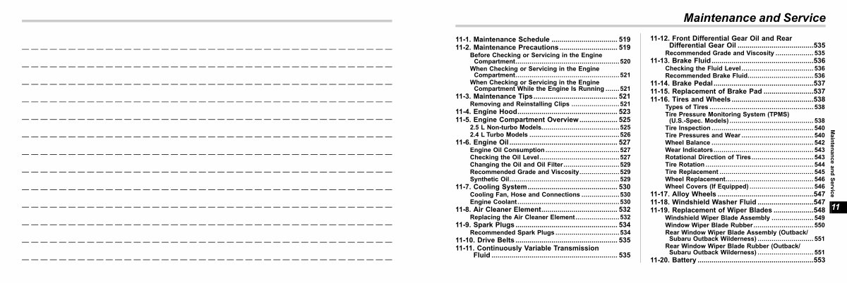 Tire Inspection................................................... 540 Tire Pressures and Wear.................................... 540 Wheel Balance................................................... 542 Wear Indicators.................................................. 543 Rotational Direction of Tires............................... 543 Tire Rotation...................................................... 544 Tire Replacement............................................... 545 Wheel Replacement............................................ 546 Wheel Covers( If Equipped)................................ 546 11-17. Alloy Wheels................................................ 547 11-18. Windshield Washer Fluid............................ 547 11-19. Replacement of Wiper Blades.................... 548 Windshield Wiper Blade Assembly..................... 549 Window Wiper Blade Rubber.............................. 550 Rear Window Wiper Blade Assembly( Outback / Subaru Outback Wilderness)............................ 551