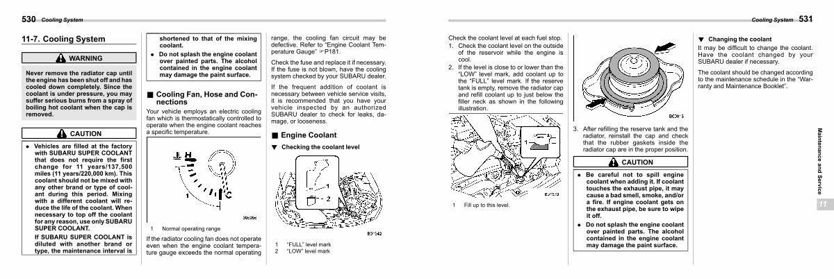 If the frequent addition of coolant is necessary between vehicle service visits, it is recommended that you have your vehicle inspected by an authorized SUBARU dealer to check for leaks, damage, or looseness.