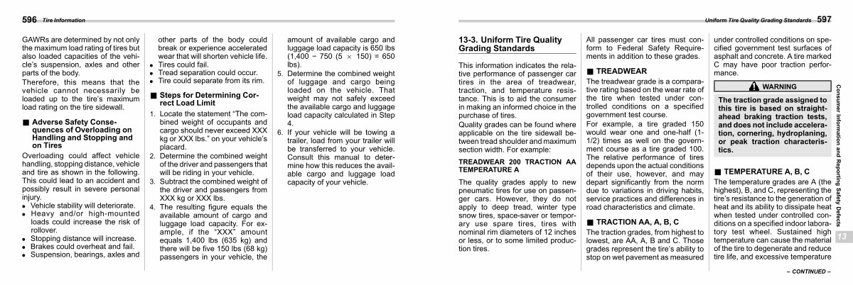 Overloading could affect vehicle handling, stopping distance, vehicle and tire as shown in the following. This could lead to an accident and possibly result in severe personal injury.