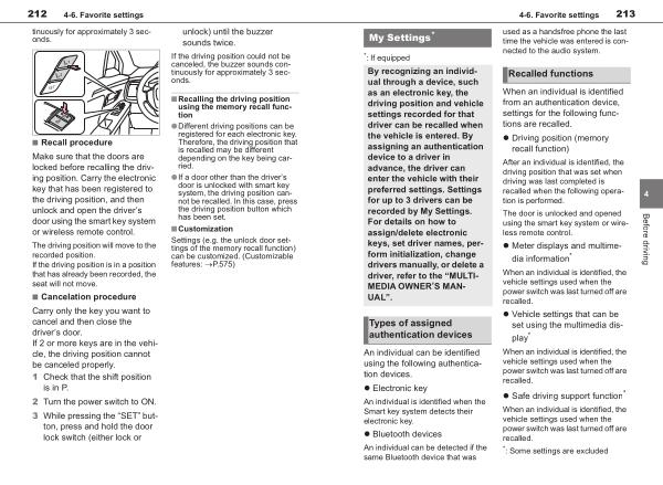 By recognizing an individual through a device , such as an electronic key , the driving position and vehicle settings recorded for that driver can be recalled when the vehicle is entered . By assigning an authentication device to a driver in advance , the driver can enter the vehicle with their preferred settings . Settings for up to 3 drivers can be recorded by My Settings . For details on how to assign / delete electronic keys , set driver names , perform initialization , change drivers manually , or delete a driver , refer to the “ MULTI- MEDIA OWNER ’ S MAN- UAL ”.