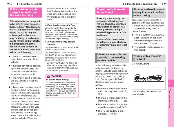 In the following situations , it is not possible to be towed by another vehicle using cables or chains , as the front wheels may be locked due to the parking lock . Contact your SUBARU dealer or commercial towing service .