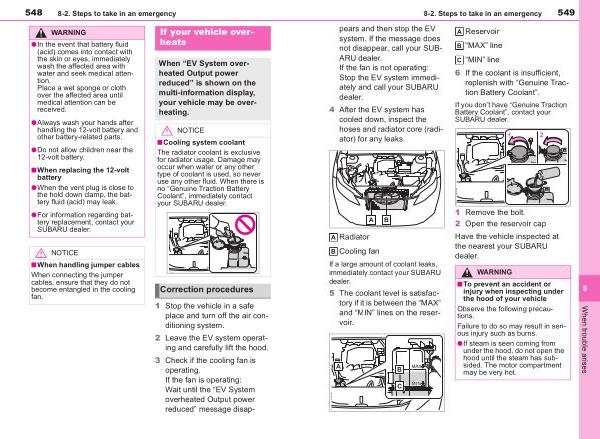 The radiator coolant is exclusive for radiator usage . Damage may occur when water or any other type of coolant is used , so never use any other fluid . When there is no “ Genuine Traction Battery Coolant ”, immediately contact your SUBARU dealer .