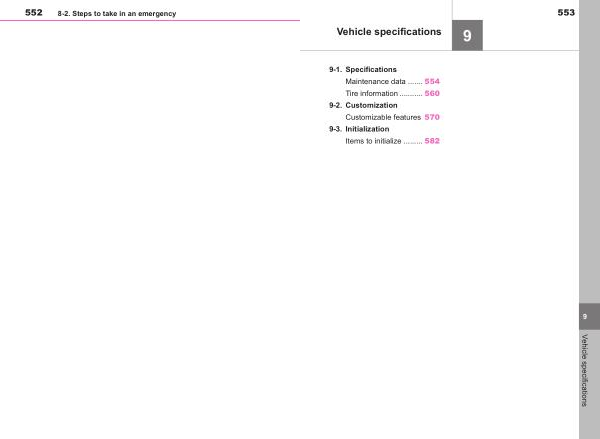 9-1 . Specifications Maintenance data ....... 554 Tire information ........... 560