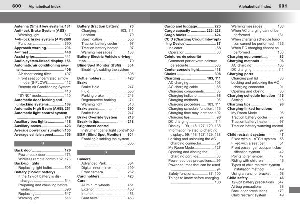 Ceintures de sécurité Comment porter votre ceinture de sécurité .......................... 585 Center console light ............... 418 Chains ..................................... 398 Charging ......................... 103 , 111 AC charging ......................... 103 AC charging cable .................. 85 Charging components ............ 83 Charging indicator .................. 88 Charging methods .................. 96 Charging procedure ..... 103 , 111 Charging schedule function .. 116 Charging time may increase 102 Charging tips .......................... 98 DC charging ......................... 111 Display ... 99 , 118 , 127 , 129 , 138 Information related to charging display .. 99 , 118 , 127 , 129 , 138 Locking and unlocking the AC charging connector ............... 91 My Room Mode .................... 127 Opening and closing the charging port lids .................. 83 Power sources precautions .... 95 Power sources that can be used ............................................. 94 Safety functions .............. 87 , 100 Things to know before charging ........................................... 100