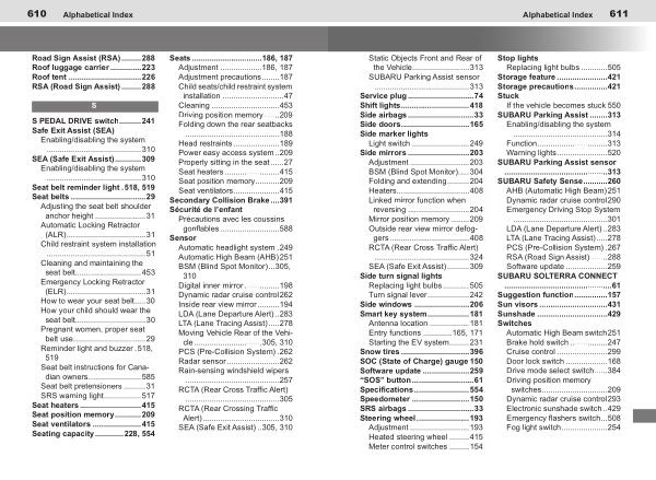 Static Objects Front and Rear of the Vehicle .......................... 313 SUBARU Parking Assist sensor ........................................... 313 Service plug .............................. 74 Shift lights ............................... 418 Side airbags .............................. 33 Side doors ............................... 165 Side marker lights