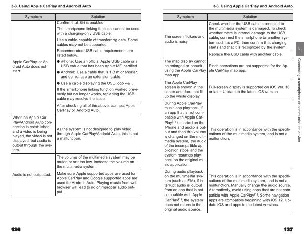 When an Apple Car- Play / Android Auto connection is established and a video is being played , the video is not displayed , but audio is output through the system .