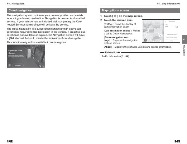 The cloud navigation is a subscription service and an active subscription is required to use navigation in the vehicle . If an active subscription is not available or expired , the Navigation screen will have a [ Get started ] button to initiate the activation of cloud navigation .
