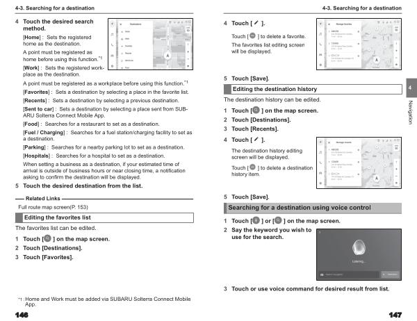 1 : Home and Work must be added via SUBARU Solterra Connect Mobile App .