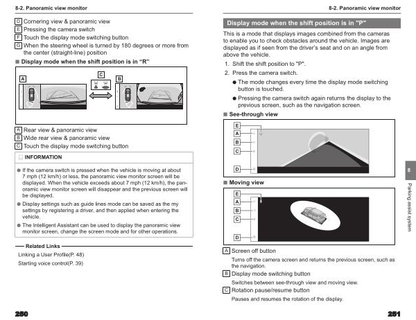 This is a mode that displays images combined from the cameras to enable you to check obstacles around the vehicle . Images are displayed as if seen from the driver ’ s seat and on an angle from above the vehicle .