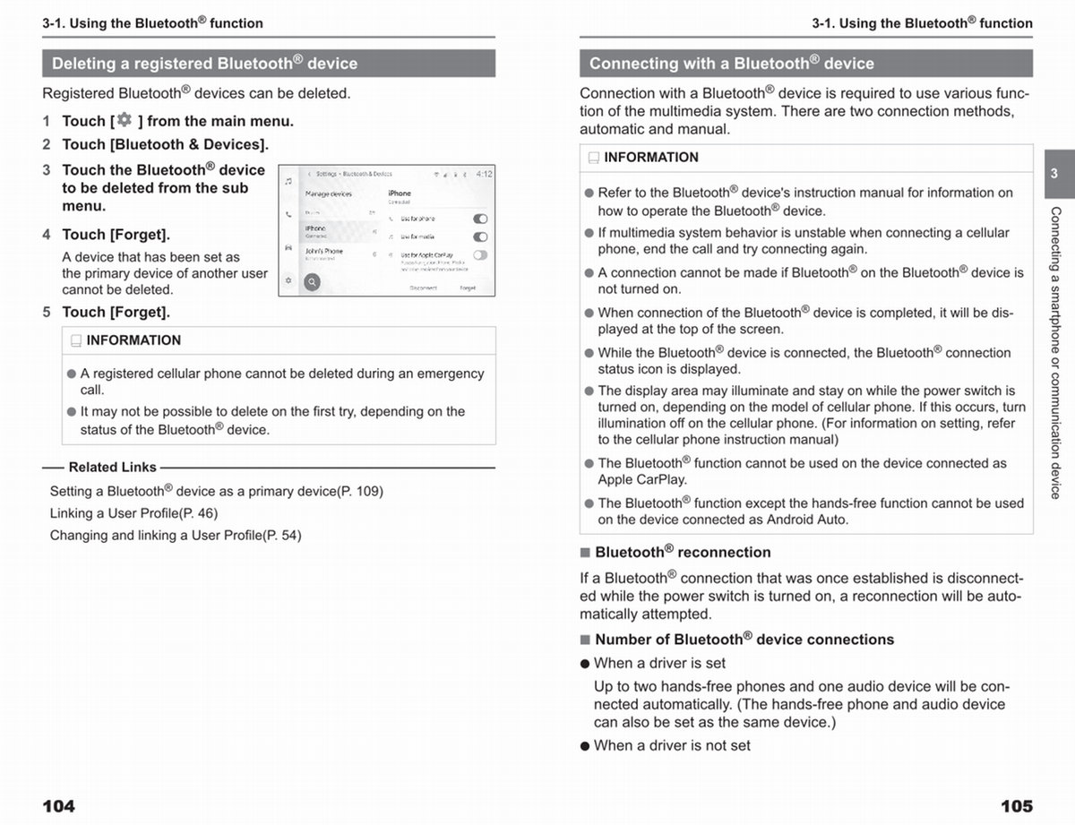 Connection with a Bluetooth ® device is required to use various function of the multimedia system. There are two connection methods, automatic and manual.
