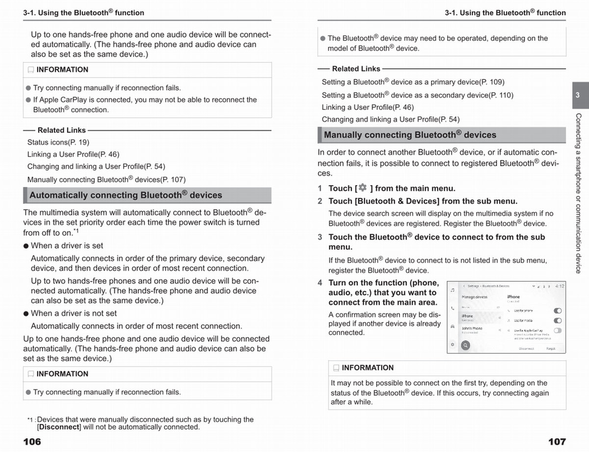 Related Links Setting a Bluetooth ® device as a primary device( P. 109) Setting a Bluetooth ® device as a secondary device( P. 110) Linking a User Profile( P. 46) Changing and linking a User Profile( P. 54)
