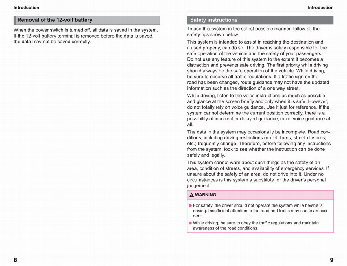 The data in the system may occasionally be incomplete. Road conditions, including driving restrictions( no left turns, street closures, etc.) frequently change. Therefore, before following any instructions from the system, look to see whether the instruction can be done safely and legally.