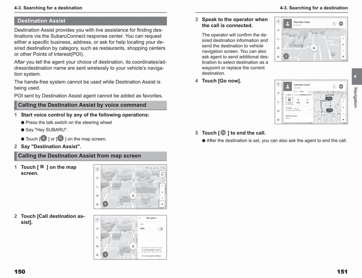 Destination Assist provides you with live assistance for finding destinations via the SubaruConnect response center. You can request either a specific business, address, or ask for help locating your desired destination by category, such as restaurants, shopping centers or other Points of Interest( POI).