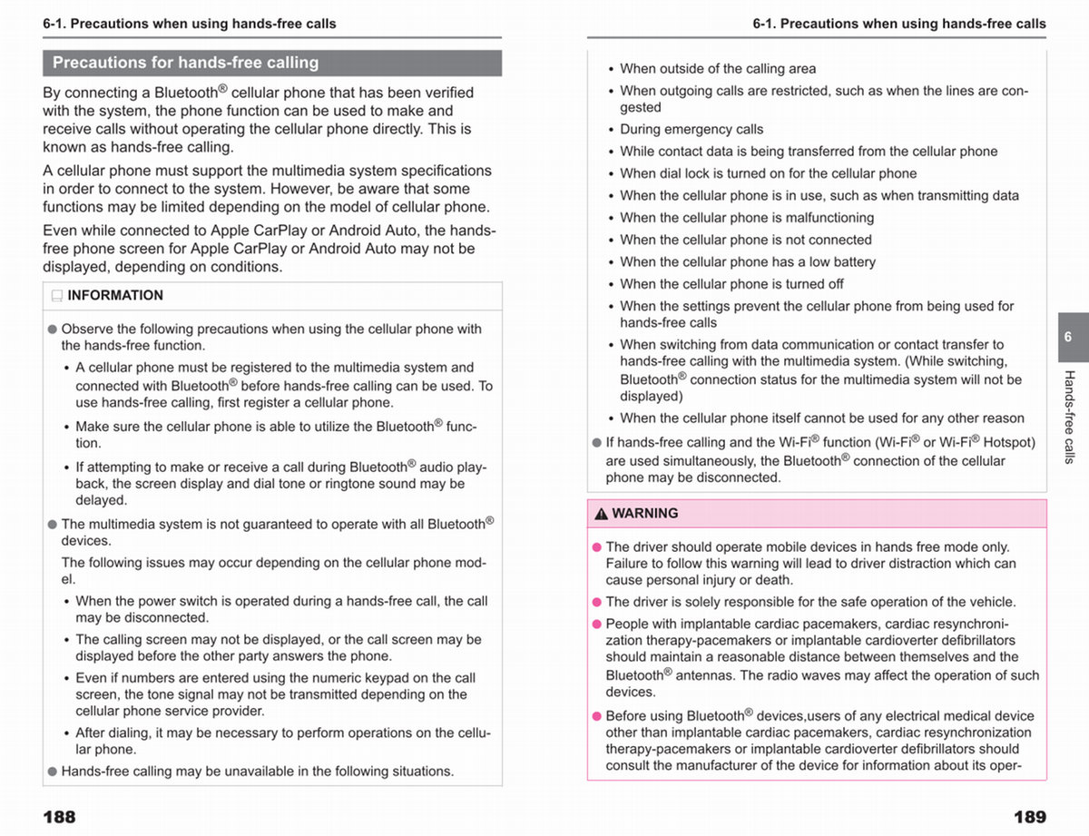 ● If hands-free calling and the Wi-Fi ® function( Wi-Fi ® or Wi-Fi ® Hotspot) are used simultaneously, the Bluetooth ® connection of the cellular phone may be disconnected.