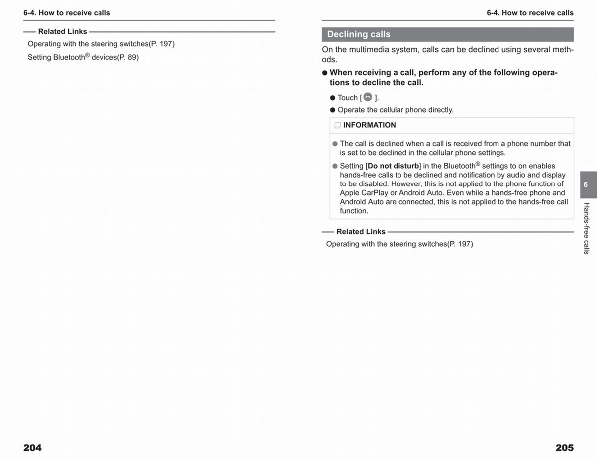 ● Setting [ Do not disturb ] in the Bluetooth ® settings to on enables hands-free calls to be declined and notification by audio and display to be disabled. However, this is not applied to the phone function of Apple CarPlay or Android Auto. Even while a hands-free phone and Android Auto are connected, this is not applied to the hands-free call function.