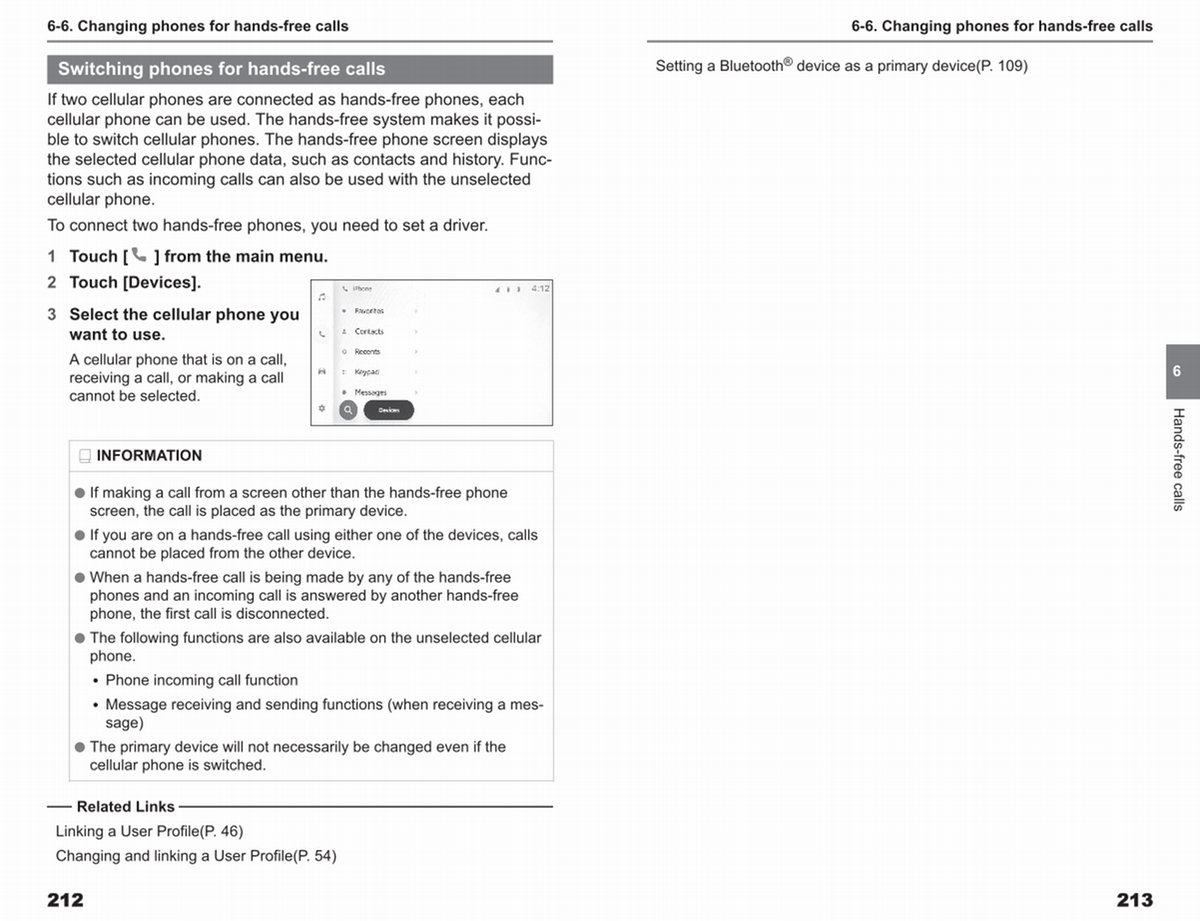 If two cellular phones are connected as hands-free phones, each cellular phone can be used. The hands-free system makes it possible to switch cellular phones. The hands-free phone screen displays the selected cellular phone data, such as contacts and history. Functions such as incoming calls can also be used with the unselected cellular phone.