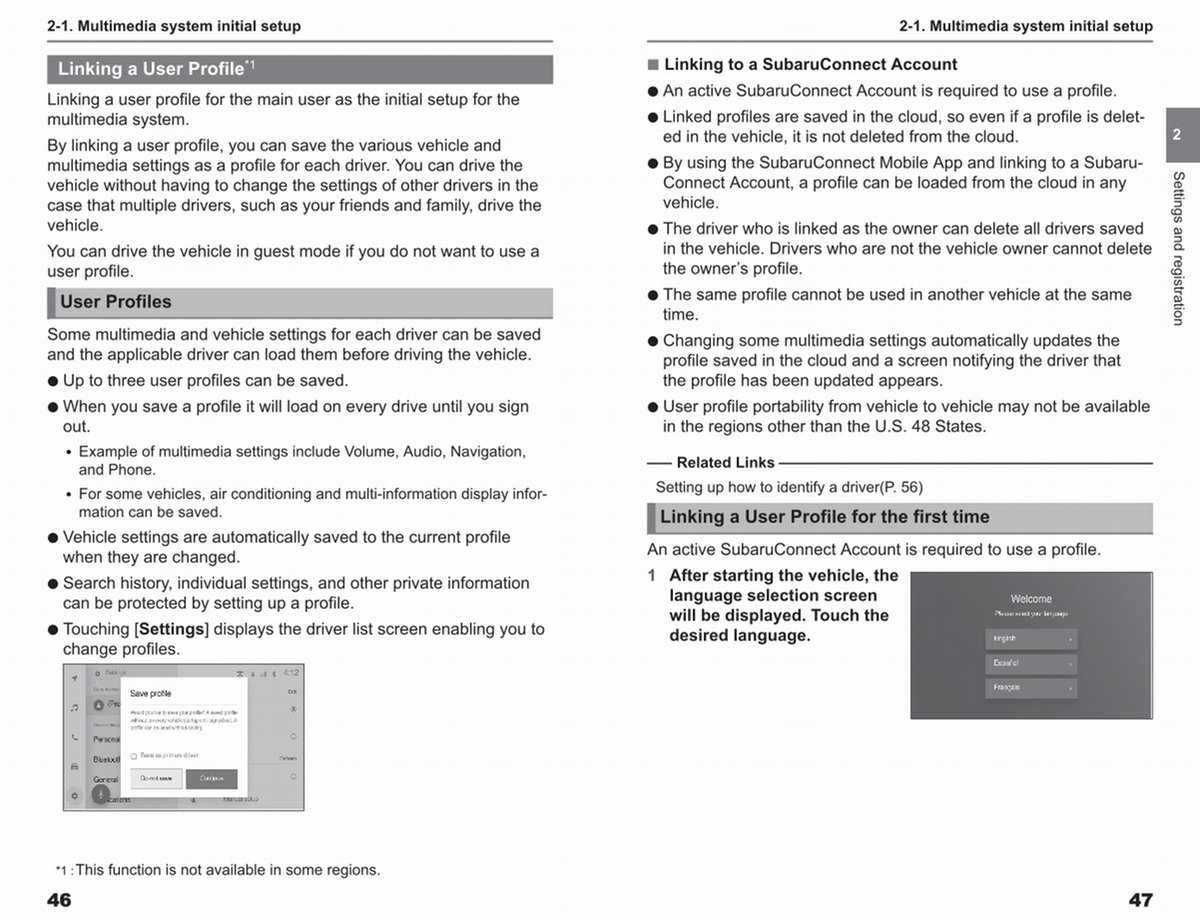 ● By using the SubaruConnect Mobile App and linking to a Subaru- Connect Account, a profile can be loaded from the cloud in any vehicle.