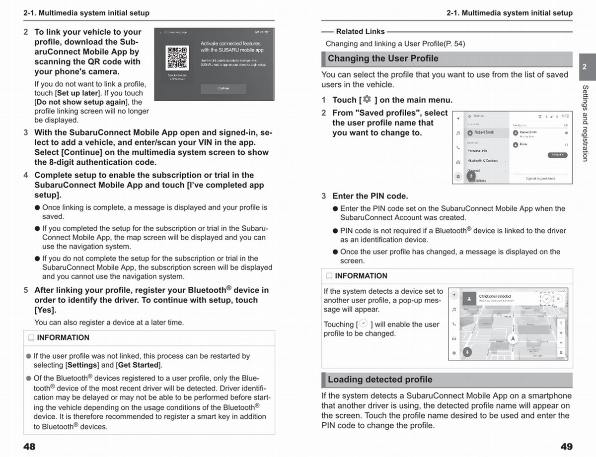 If the system detects a SubaruConnect Mobile App on a smartphone that another driver is using, the detected profile name will appear on the screen. Touch the profile name desired to be used and enter the PIN code to change the profile.