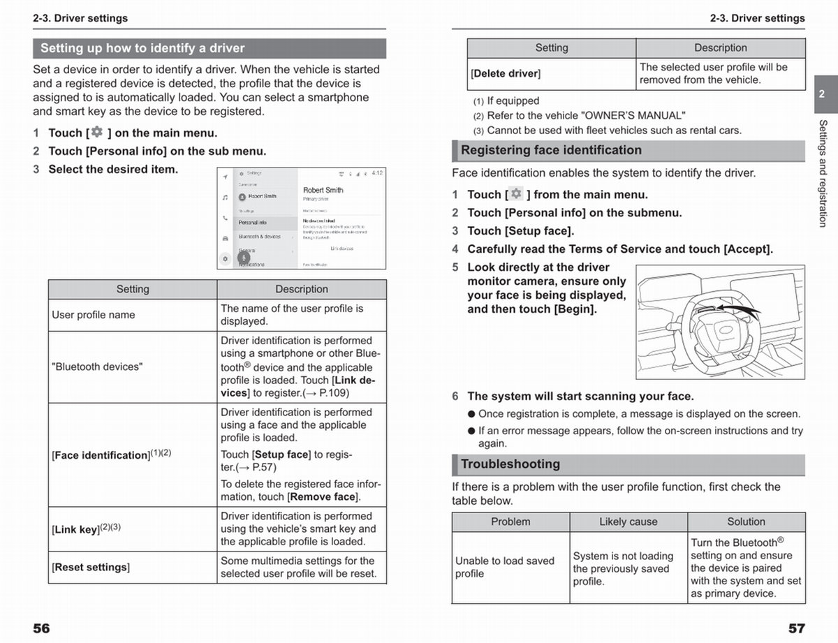 Driver identification is performed using a smartphone or other Bluetooth ® device and the applicable profile is loaded. Touch [ Link devices ] to register.( → P. 109)