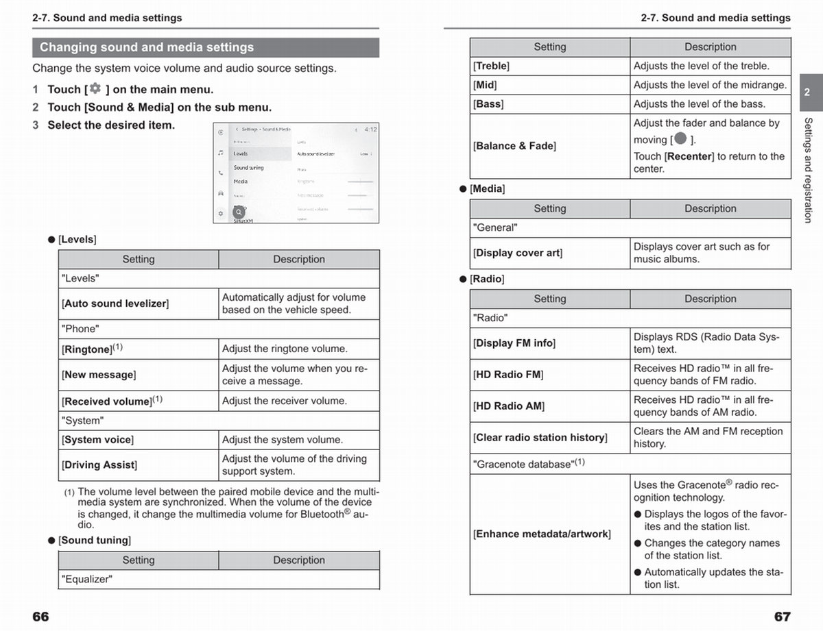 ( 1) The volume level between the paired mobile device and the multimedia system are synchronized. When the volume of the device is changed, it change the multimedia volume for Bluetooth ® audio.