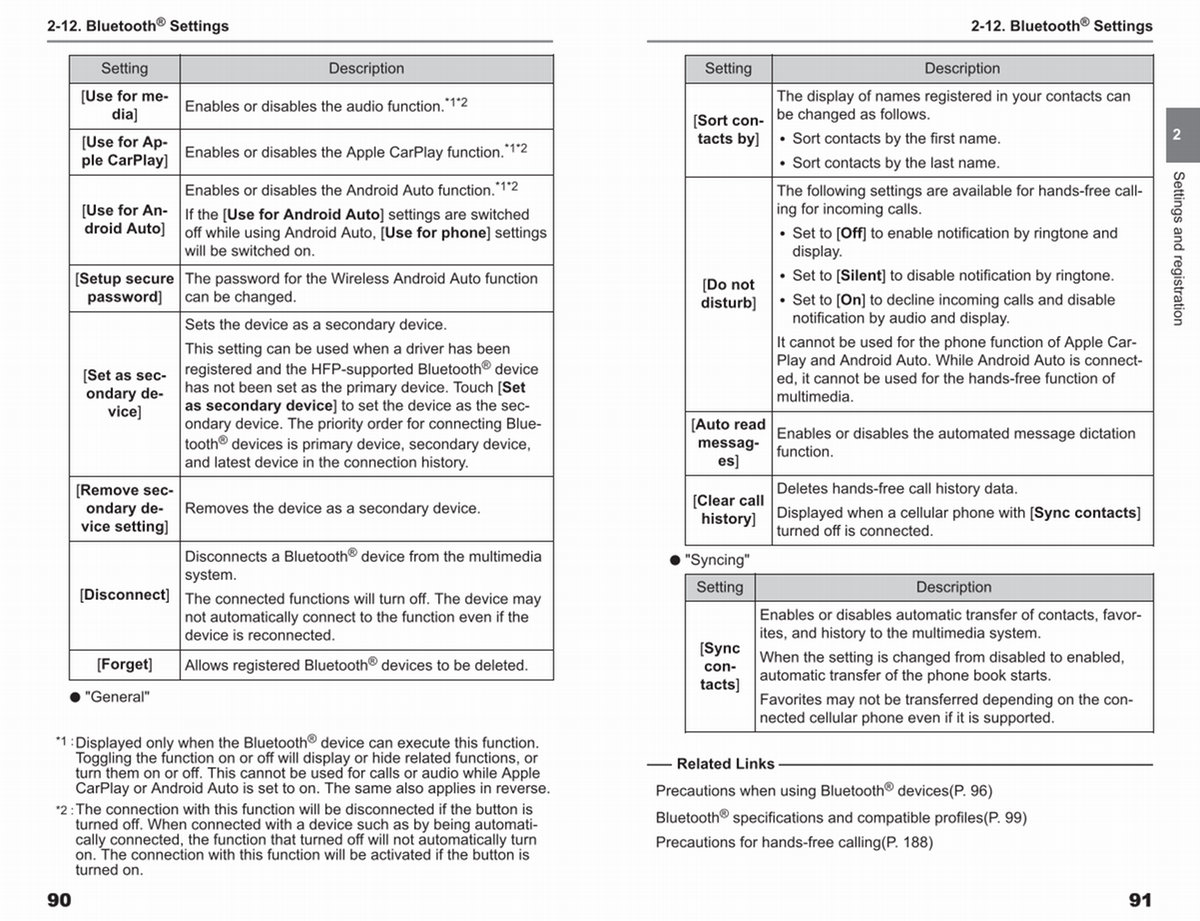 Related Links Precautions when using Bluetooth ® devices( P. 96) Bluetooth ® specifications and compatible profiles( P. 99) Precautions for hands-free calling( P. 188)