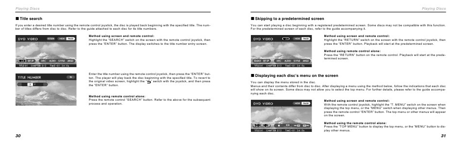 Enter the title number using the remote control joystick, then press the “ENTER” button. The player will play back the disc beginning with the specified title. To revert to