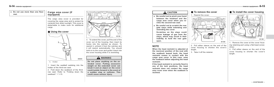 6-14 Interior equipment . Do not use more than one floor mat. Cargo area cover (if equipped) The cargo area cover is provided for covering the cargo area and to protect its contents from direct sunlight. This cover is detachable to make room for additional cargo. & Using the cover 3. To extend the cover, pull the end of the cover out of the housing, then insert its hooks into the catches as shown. To rewind it, unhook it from the catches and it will rewind automatically. You should hold on to the cover and guide it back into the cover housing while it is rewinding. WARNING 1) Holder 1. Insert the seatbelt webbing into the holder of the third-row seat. 2. Fold down the seatback of the thirdrow seat. Refer to “Folding down the seatback” F1-15. Do not place anything on the extended cover. Putting excessive weight on the extended cover can break it and an object on the cover could tumble forward in the event of a sudden stop or collision. This could cause serious injury.