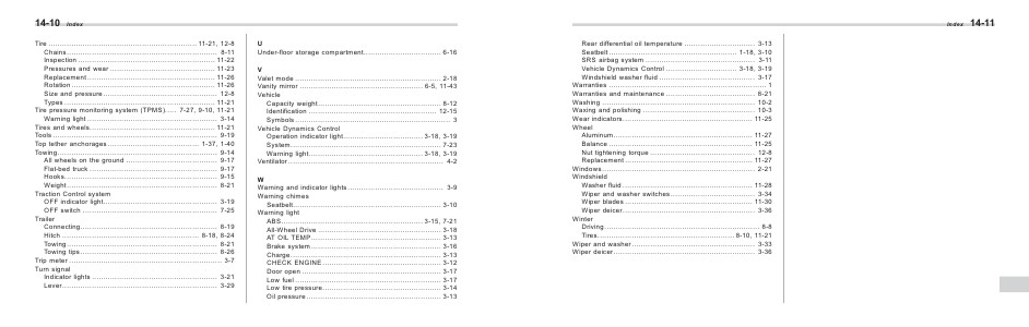 Tire pressure monitoring system (TPMS)..... 7-27, 9-10, 11-21