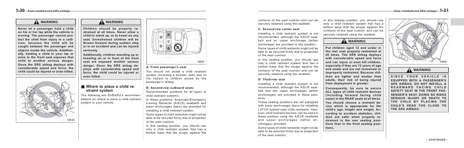 Seat, seatbelt and SRS airbags contours of the seat cushion and can be securely retained using the seatbelt. C: Second-row center seat Installing a child restraint system is not recommended, although the A/ELR seatbelt and an upper anchorage (tether anchorage) are provided in this position. Some types of child restraints might not be able to be secured firmly due to projection of the seat cushion. In this seating position, you should use only a child restraint system that has a bottom base that fits snugly against the contours of the seat cushion and can be securely retained using the seatbelt. D: Third-row seat Installing a child restraint system is not recommended, although the A/ELR seatbelt and two upper anchorages (tether anchorages) are provided in these positions. These seating positions are not equipped with lower anchorages (bars) for installing LATCH system-type child restraints. However, child restraint devices can be used in these position using the A/ELR seatbelts and upper anchorages (tether anchorages) provided. Some types of child restraints might not be able to be secured firmly due to projection of the seat cushion. 1-31 In this seating position, you should use only a child restraint system that has a bottom base that fits snugly against the contours of the seat cushion and can be securely retained using the seatbelt. WARNING Put children aged 12 and under in the rear seat properly restrained at all times. The SRS airbag deploys with considerable speed and force and can injure or even kill children, especially if they are 12 years of age and under and are not restrained or improperly restrained. Because children are lighter and weaker than adults, their risk of being injured from deployment is greater. Consequently, be sure to secure ALL types of child restraint devices (including forward facing child seats) in the REAR seats at all times. You should choose a restraint device which is appropriate for the child’s age, height and weight. According to accident statistics, children are safer when properly restrained in the rear seating positions than in the front seating positions. WARNING SINCE YOUR VEHICLE IS EQUIPPED WITH A PASSENGER’S SRS AIRBAG, DO NOT INSTALL A R E A R WA R D F A C I N G C H I L D SAFETY SEAT IN THE FRONT PASSENGER’S SEAT. DOING SO RISKS SERIOUS INJURY OR DEATH TO THE CHILD BY PLACING THE CHILD’S HEAD TOO CLOSE TO THE SRS AIRBAG. – CONTINUED –