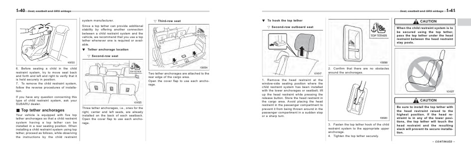 1-40 Seat, seatbelt and SRS airbags system manufacturer. ! Third-row seat Since a top tether can provide additional stability by offering another connection between a child restraint system and the vehicle, we recommend that you use a top tether whenever one is required or available. ! Tether anchorage location ! Second-row seat 6. Before seating a child in the child restraint system, try to move seat back and forth and left and right to verify that it is held securely in position. 7. To remove the child restraint system, follow the reverse procedures of installation. Two tether anchorages are attached to the rear edge of the cargo area. Open the cover flap to use each anchorage. If you have any question concerning this type of child restraint system, ask your SUBARU dealer. & Top tether anchorages Your vehicle is equipped with five top tether anchorages so that a child restraint system having a top tether can be installed in a rear seating position. When installing a child restraint system using top tether, proceed as follows, while observing the instructions by the child restraint Three tether anchorages, i.e., ones for the right, center and left seats, are already installed on the back of each seatback. Open the cover flap to use each anchorage.