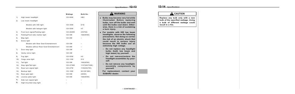 12-14 Specifications CAUTION Replace any bulb only with a new bulb of the specified wattage. Using a bulb of different wattage could result in a fire.