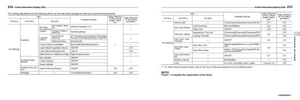 Available settings for the vehicle