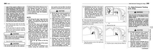 . Always use a genuine SUBARU fuel filler cap . If you use the wrong cap , it may not fit or have proper venting and your fuel tank and emission control system may be damaged . It could also lead to fuel spillage and a fire .
