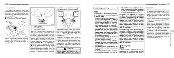. The gear position automatically shifts up when the engine speed approaches the red zone of the tachometer ( except when using the Sport Sharp ( S #) mode ( SI-DRIVE models ) or in the Sport + mode ( Drive Mode Select models )).