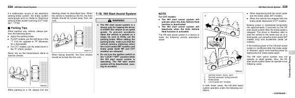 . The Hill start assist system is a device only for helping the driver to START the vehicle on an uphill grade . To prevent accidents when the vehicle is parked on a slope , be sure to firmly set the parking brake . When setting the parking brake , make sure that the vehicle remains stationary when the clutch pedal ( MT models ) and brake pedal ( both MT and CVT models ) are released .