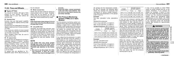 Example : Tire size : 245 / 35R19 93Y Standard tire pressures : Front : 35 psi ( 240 kPa , 2.4 kgf / cm 2 ) Rear : 32 psi ( 220 kPa , 2.2 kgf / cm 2 ) Garage temperature : 608F ( 15.68C )