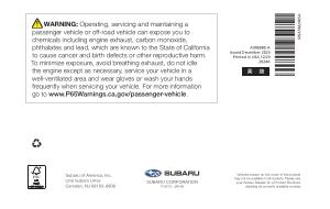 WARNING : Operating , servicing and maintaining a passenger vehicle or off-road vehicle can expose you to chemicals including engine exhaust , carbon monoxide , phthalates and lead , which are known to the State of California to cause cancer and birth defects or other reproductive harm . To minimize exposure , avoid breathing exhaust , do not idle the engine except as necessary , service your vehicle in a well-ventilated area and wear gloves or wash your hands frequently when servicing your vehicle . For more information go to www . P65Warnings . ca . gov / passenger-vehicle .