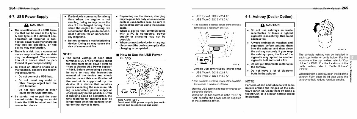 . The rated voltage of each USB terminal is DC 5 V. For details about the maximum rated power, refer to“ How to Use the USB Power Supply” FP264. Before connecting a device, be sure to read the instruction manual of the device and check whether or not this specification of the output is supported by the device. If a device that requires power exceeding the maximum rating is connected, power supply or charging may not be possible. Even if charging could be completed, the time required for charging may be longer than when the genuine charger for that device is used.