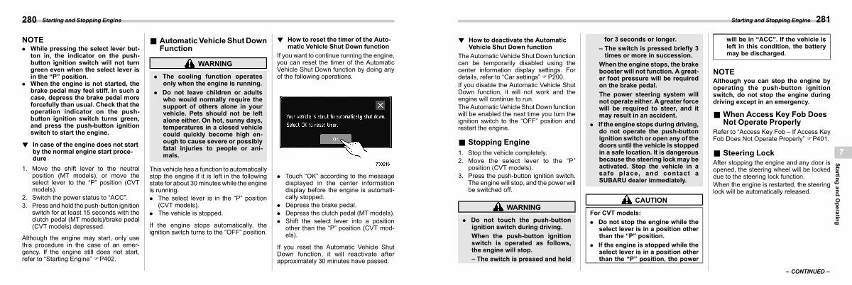 . If the engine stops during driving, do not operate the push-button ignition switch or open any of the doors until the vehicle is stopped in a safe location. It is dangerous because the steering lock may be activated. Stop the vehicle in a safe place, and contact a SUBARU dealer immediately.