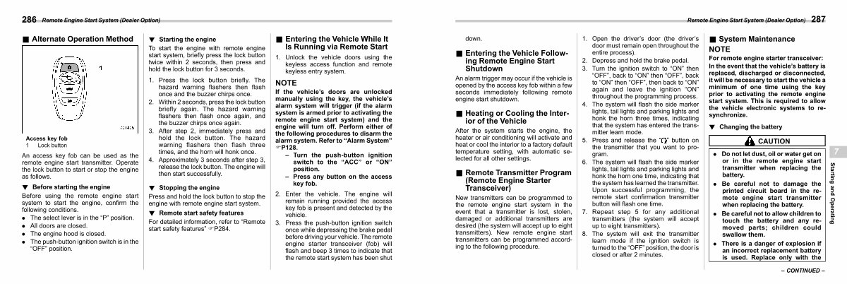 An access key fob can be used as the remote engine start transmitter. Operate the lock button to start or stop the engine as follows.
