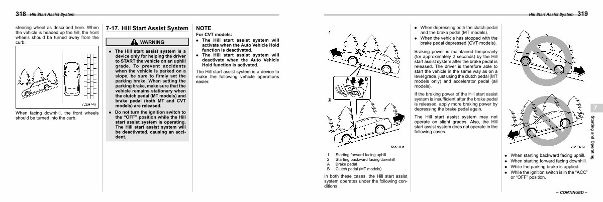 Braking power is maintained temporarily( for approximately 2 seconds) by the Hill start assist system after the brake pedal is released. The driver is therefore able to start the vehicle in the same way as on a level grade, just using the clutch pedal( MT models only) and accelerator pedal( all models). |