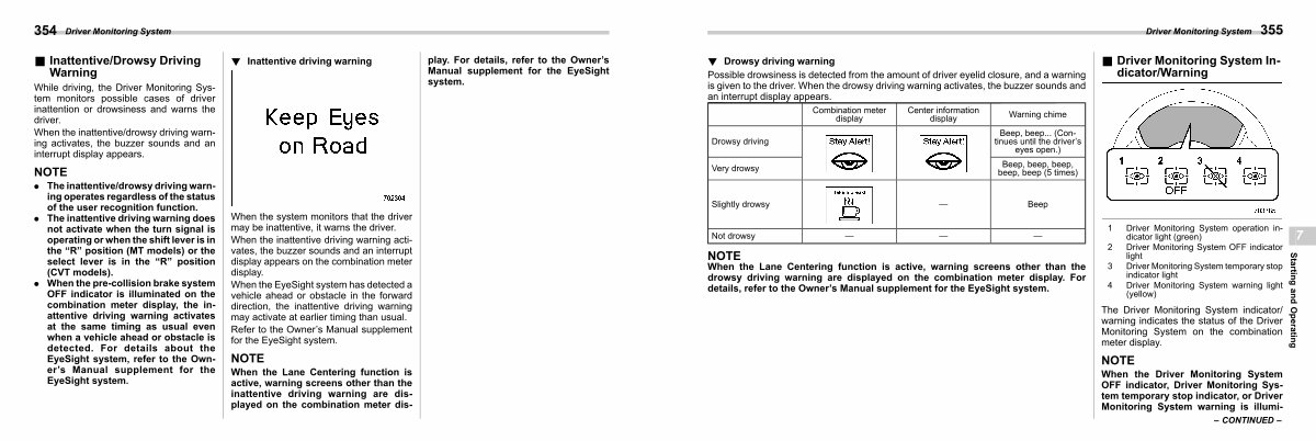 drowsy driving warning are displayed on the combination meter display. For details, refer to the Owner’ s Manual supplement for the EyeSight system.
