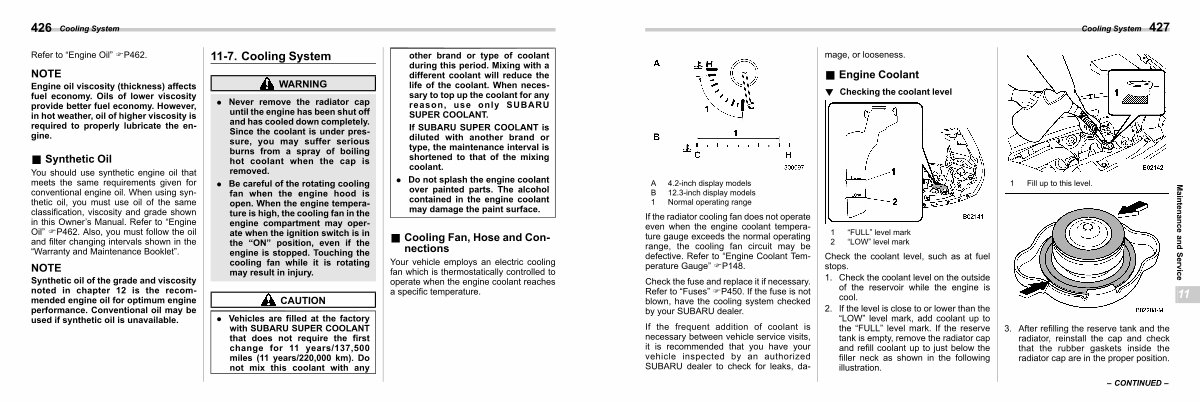 If the frequent addition of coolant is necessary between vehicle service visits, it is recommended that you have your vehicle inspected by an authorized SUBARU dealer to check for leaks, da-