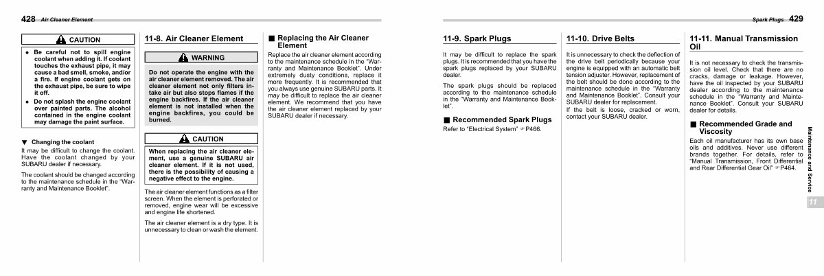 It may be difficult to replace the spark plugs. It is recommended that you have the spark plugs replaced by your SUBARU dealer.
