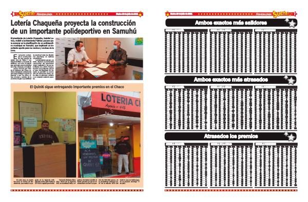 7 Martes 20 de julio de 2021 Atrasados los premios Ambos exactos más salidores Ambos exactos más atrasados QUINIELA CHAQUEÑA Núm Cant . 00 72 01 70 02 83 03 68 04 66 05 61 06 74 07 82 08 76 09 61 10 79 11 71 12 73 13 83 14 62 15 77 16 73 17 77 18 66 19 68 Núm Cant . 20 60 21 68 22 59 23 58 24 74 25 65 26 77 27 67 28 68 29 70 30 69 31 65 32 81 33 75 34 81 35 78 36 72 37 72 38 60 39 77 Núm Cant . 40 58 41 71 42 64 43 66 44 71 45 87 46 78 47 66 48 80 49 79 50 73 51 60 52 59 53 87 54 72 55 81 56 53 57 74 58 74 59 59 Núm Cant . 60 80 61 62 62 65 63 62 64 61 65 65 66 68 67 50 68 70 69 65 70 67 71 63 72 66 73 72 74 77 75 69 76 66 77 57 78 67 79 67 Núm Cant . 80 69 81 64 82 64 83 68 84 64 85 64 86 75 87 57 88 69 89 54 90 74 91 62 92 52 93 72 94 73 95 60 96 90 97 65 98 63 99 61 QUINIELA DE LA CIUDAD Núm Cant . 00 66 01 51 02 55 03 60 04 73 05 80 06 81 07 79 08 54 09 80 10 79 11 84 12 83 13 59 14 64 15 60 16 64 17 86 18 96 19 84 Núm Cant . 20 70 21 72 22 71 23 87 24 50 25 68 26 73 27 68 28 85 29 76 30 68 31 72 32 81 33 67 34 64 35 59 36 58 37 57 38 79 39 68 Núm Cant . 40 78 41 88 42 69 43 72 44 83 45 49 46 67 47 54 48 61 49 71 50 65 51 58 52 55 53 71 54 92 55 52 56 65 57 64 58 69 59 70 Núm Cant . 60 66 61 63 62 65 63 71 64 72 65 72 66 54 67 63 68 70 69 66 70 66 71 75 72 75 73 65 74 80 75 78 76 64 77 68 78 61 79 71 Núm Cant . 80 68 81 65 82 70 83 72 84 76 85 68 86 76 87 70 88 59 89 59 90 63 91 66 92 51 93 77 94 69 95 69 96 59 97 72 98 82 99 66 QUINIELA BONAERENSE Núm Cant . 00 58 01 77 02 75 03 64 04 65 05 80 06 96 07 72 08 64 09 74 10 67 11 72 12 79 13 63 14 64 15 71 16 54 17 59 18 66 19 87 Núm Cant . 20 94 21 62 22 63 23 52 24 75 25 74 26 61 27 65 28 76 29 71 30 74 31 69 32 80 33 83 34 64 35 74 36 73 37 80 38 57 39 51 Núm Cant . 40 80 41 64 42 59 43 72 44 87 45 64 46 52 47 77 48 76 49 82 50 71 51 51 52 69 53 60 54 81 55 73 56 77 57 74 58 56 59 69 Núm Cant . 60 49 61 71 62 71 63 80 64 62 65 66 66 63 67 73 68 94 69 71 70 80 71 73 72 69 73 63 74 64 75 65 76 70 77 69 78 78 79 65 Núm Cant . 80 71 81 70 82 59 83 84 84 67 85 59 86 57 87 54 88 63 89 67 90 86 91 60 92 78 93 74 94 78 95 76 96 80 97 65 98 64 99 59 QUINIELA CHAQUEÑA Núm Cant . 00 6 01 94 02 136 03 11 04 73 05 97 06 228 07 93 08 271 09 5 10 255 11 138 12 15 13 20 14 101 15 19 16 2 17 122 18 12 19 17 Núm Cant . 20 269 21 58 22 79 23 166 24 153 25 119 26 34 27 13 28 154 29 29 30 139 31 24 32 52 33 90 34 35 35 301 36 355 37 202 38 65 39 41 Núm Cant . 40 67 41 108 42 23 43 129 44 37 45 123 46 7 47 38 48 69 49 48 50 27 51 50 52 186 53 9 54 25 55 32 56 193 57 84 58 82 59 296 Núm Cant . 60 64 61 0 62 221 63 87 64 21 65 124 66 81 67 16 68 14 69 80 70 188 71 66 72 51 73 368 74 61 75 147 76 128 77 4 78 160 79 1 Núm Cant . 80 104 81 410 82 33 83 36 84 115 85 22 86 18 87 10 88 103 89 213 90 30 91 252 92 43 93 26 94 77 95 3 96 149 97 8 98 71 99 40 QUINIELA DE LA CIUDAD Núm Cant . 00 78 01 46 02 153 03 249 04 44 05 45 06 76 07 490 08 110 09 22 10 25 11 41 12 112 13 13 14 77 15 201 16 186 17 7 18 0 19 96 Núm Cant . 20 180 21 61 22 11 23 48 24 253 25 4 26 91 27 12 28 59 29 156 30 40 31 87 32 100 33 62 34 103 35 51 36 146 37 14 38 15 39 67 Núm Cant . 40 33 41 35 42 99 43 121 44 82 45 84 46 28 47 79 48 182 49 9 50 247 51 5 52 164 53 127 54 24 55 230 56 3 57 282 58 299 59 6 Núm Cant . 60 34 61 16 62 60 63 38 64 8 65 94 66 145 67 444 68 55 69 118 70 43 71 120 72 36 73 124 74 30 75 158 76 106 77 167 78 66 79 31 Núm Cant . 80 49 81 27 82 317 83 1 84 141 85 63 86 228 87 129 88 2 89 137 90 539 91 192 92 32 93 10 94 399 95 37 96 133 97 547 98 122 99 57 QUINIELA BONAERENSE Núm Cant . 00 126 01 76 02 145 03 151 04 16 05 23 06 36 07 399 08 75 09 156 10 55 11 11 12 24 13 52 14 12 15 300 16 141 17 98 18 39 19 28 Núm Cant . 20 104 21 88 22 238 23 160 24 210 25 35 26 318 27 17 28 95 29 44 30 6 31 51 32 675 33 308 34 21 35 56 36 37 37 117 38 25 39 107 Núm Cant . 40 163 41 81 42 133 43 60 44 73 45 10 46 196 47 120 48 105 49 124 50 7 51 92 52 18 53 32 54 176 55 427 56 102 57 53 58 543 59 143 Núm Cant . 60 161 61 14 62 221 63 41 64 2 65 460 66 27 67 119 68 171 69 59 70 158 71 110 72 45 73 230 74 63 75 50 76 118 77 20 78 86 79 48 Núm Cant . 80 30 81 66 82 47 83 154 84 144 85 62 86 71 87 42 88 3 89 9 90 43 91 0 92 77 93 1 94 57 95 4 96 26 97 13 98 8 99 132 QUINIELA CHAQUEÑA Núm Cant . 00 6 01 18 02 89 03 11 04 62 05 20 06 10 07 16 08 0 09 5 10 2 11 6 12 15 13 20 14 3 15 12 16 2 17 25 18 12 19 17 Núm Cant . 20 31 21 0 22 7 23 20 24 40 25 119 26 10 27 1 28 32 29 11 30 2 31 7 32 10 33 1 34 22 35 29 36 149 37 0 38 2 39 29 Núm Cant . 40 4 41 15 42 12 43 0 44 37 45 11 46 7 47 13 48 26 49 48 50 23 51 11 52 39 53 2 54 19 55 16 56 8 57 5 58 82 59 17 Núm Cant . 60 39 61 0 62 27 63 31 64 8 65 16 66 42 67 1 68 3 69 22 70 3 71 24 72 9 73 6 74 4 75 8 76 34 77 4 78 42 79 1 Núm Cant . 80 7 81 7 82 28 83 36 84 13 85 22 86 15 87 1 88 29 89 5 90 25 91 5 92 22 93 24 94 17 95 3 96 3 97 4 98 4 99 11 QUINIELA DE LA CIUDAD Núm Cant . 00 69 01 3 02 8 03 19 04 26 05 23 06 27 07 13 08 20 09 22 10 1 11 8 12 5 13 13 14 55 15 13 16 10 17 7 18 0 19 46 Núm Cant . 20 28 21 0 22 11 23 48 24 75 25 4 26 20 27 12 28 17 29 0 30 10 31 37 32 37 33 32 34 61 35 33 36 35 37 4 38 3 39 44 Núm Cant . 40 6 41 18 42 24 43 15 44 5 45 17 46 28 47 14 48 38 49 1 50 12 51 5 52 7 53 4 54 16 55 3 56 3 57 26 58 20 59 6 Núm Cant . 60 15 61 16 62 14 63 2 64 6 65 29 66 4 67 24 68 41 69 39 70 29 71 21 72 29 73 42 74 25 75 2 76 16 77 54 78 66 79 31 Núm Cant . 80 49 81 0 82 31 83 1 84 0 85 22 86 2 87 22 88 2 89 32 90 24 91 6 92 32 93 5 94 1 95 10 96 5 97 55 98 9 99 3 QUINIELA BONAERENSE Núm Cant . 00 6 01 47 02 14 03 1 04 16 05 3 06 36 07 14 08 32 09 30 10 7 11 11 12 2 13 51 14 12 15 24 16 17 17 47 18 19 19 28 Núm Cant . 20 43 21 4 22 71 23 59 24 5 25 2 26 3 27 17 28 6 29 44 30 6 31 11 32 4 33 3 34 0 35 1 36 22 37 15 38 25 39 31 Núm Cant . 40 20 41 28 42 19 43 0 44 4 45 10 46 56 47 28 48 11 49 13 50 7 51 10 52 9 53 32 54 17 55 29 56 1 57 29 58 0 59 31 Núm Cant . 60 26 61 14 62 18 63 35 64 2 6