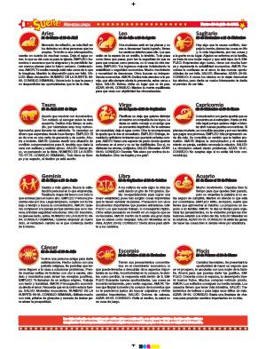 Mucho movimiento . Organiza bien tu tiempo para que quedes bien parado , pero no empeñes tu palabra si no estás seguro de cumplirla . Manten en silencio lo que está por concretarse . EMPLEO : Brillo , evolucion , suerte que tienes que aprovechar al máximo . Le propones un negocio a un familiar . AMOR : Te das un tiempo para organizar tus pensamientos , no te encierres porque las invitaciones estarán a la orden del dia . SALUD : Malestar en la columna . AZAR : 00-10 . CONSEJO : Si están las ganas de hacer las cosas bien lo demás viene por añadidura .
