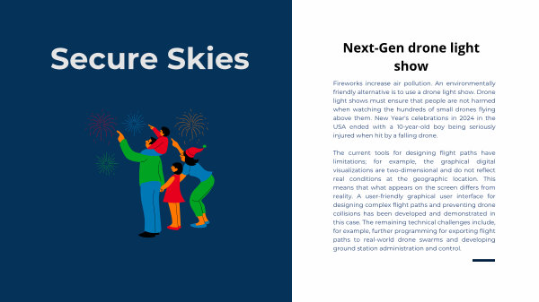 Fireworks increase air pollution. An environmentally friendly alternative is to use a drone light show. Drone light shows must ensure that people are not harmed when watching the hundreds of small drones flying above them. New Year ' s celebrations in 2024 in the USA ended with a 10-year-old boy being seriously injured when hit by a falling drone.
