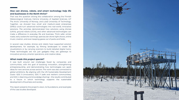 That was the question driving the collaboration among the Finnish Meteorological Institute, Centria University of Applied Sciences, UiT The Arctic University of Norway, and Luleå University of Technology. Together, we showed how small and medium-sized enterprises( SMEs) could turn advanced technologies into real-world, innovative solutions. The activities demonstrated how solutions using drones( UAVs), ground robots( UGVs), and other advanced technologies can make a difference in everyday life and business. Think safer winter roads, early avalanche warnings, spectacular drone light shows, online music creation, and even keeping geese out of parks and fields.